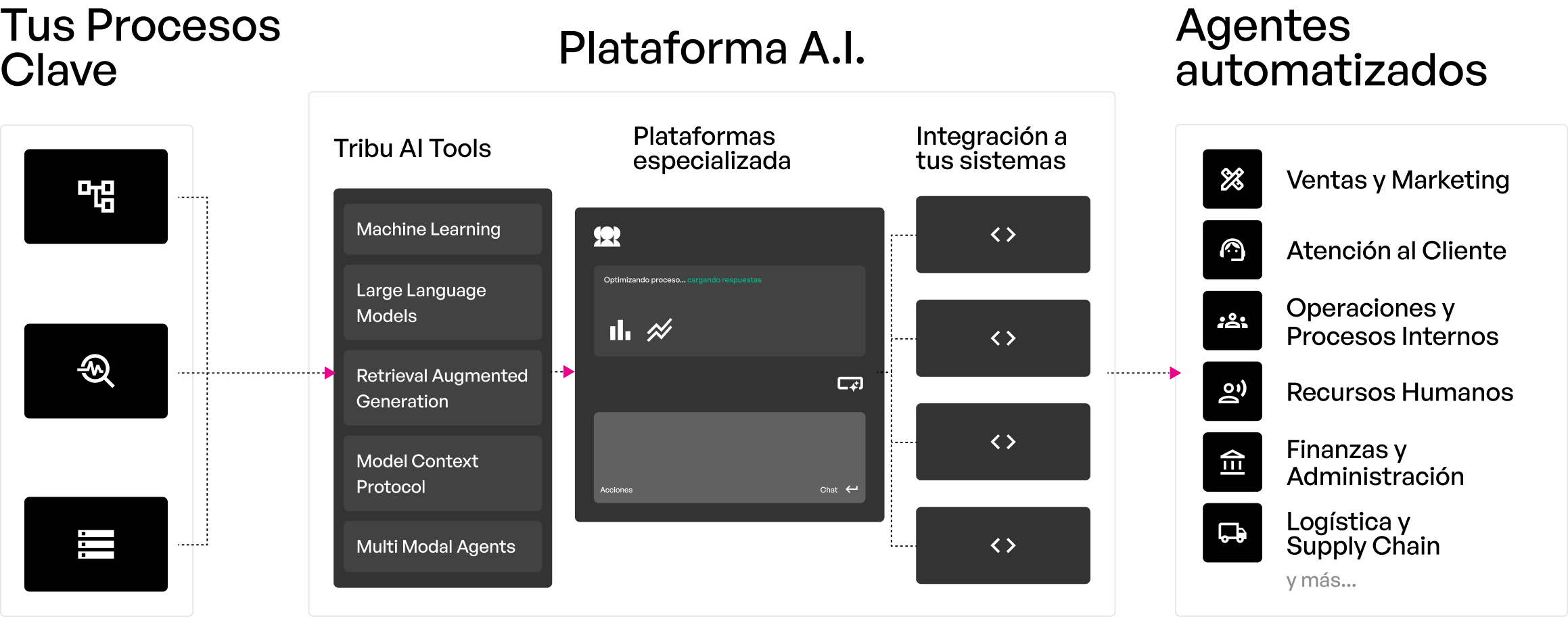 En Tribu creemos en el concepto de Hybrid Intelligence: la combinación entre el poder de la inteligencia artificial y el talento humano. Esta sinergia permite diseñar soluciones que no solo optimizan procesos, sino que potencian a tu equipo para alcanzar un nivel superior de eficiencia y estrategia.